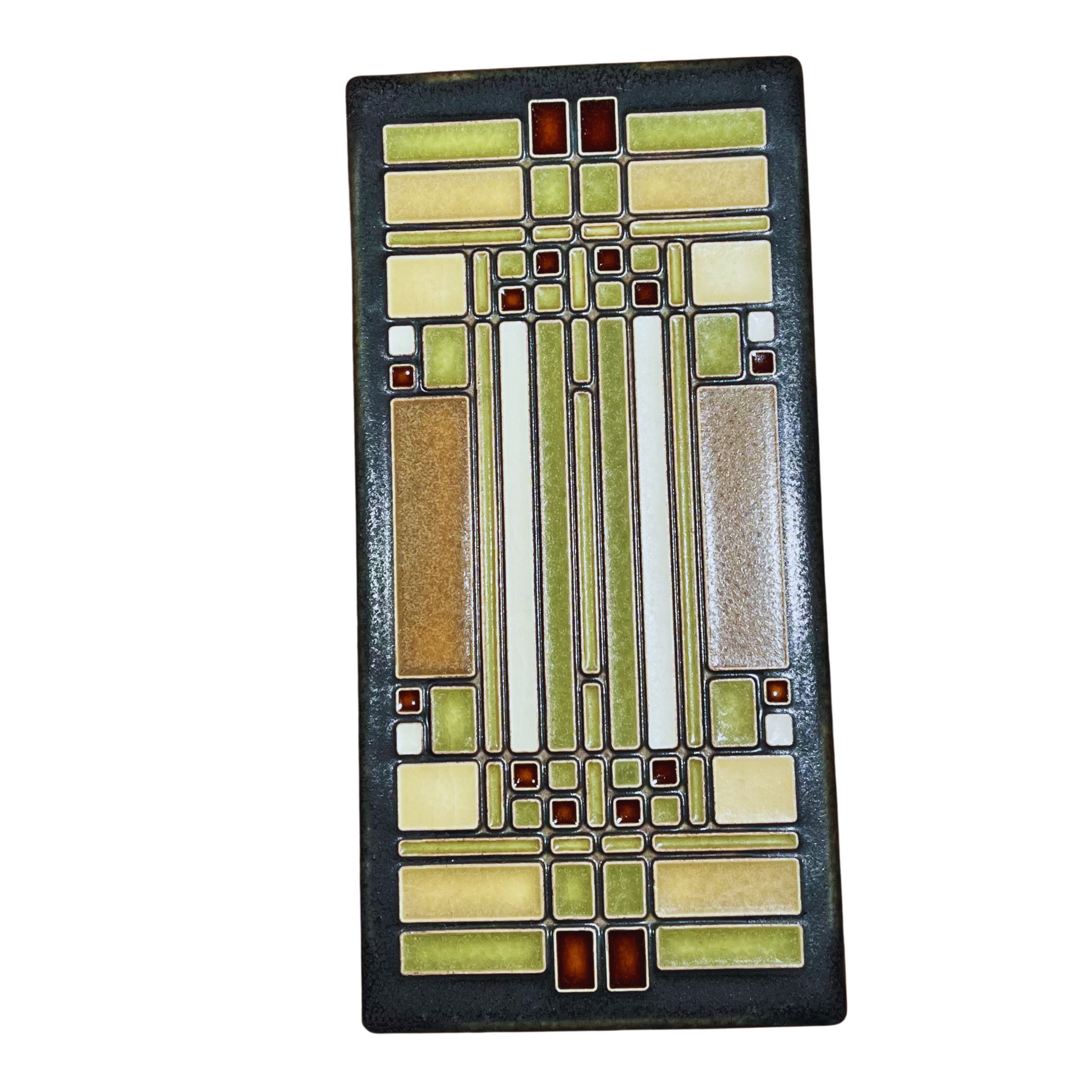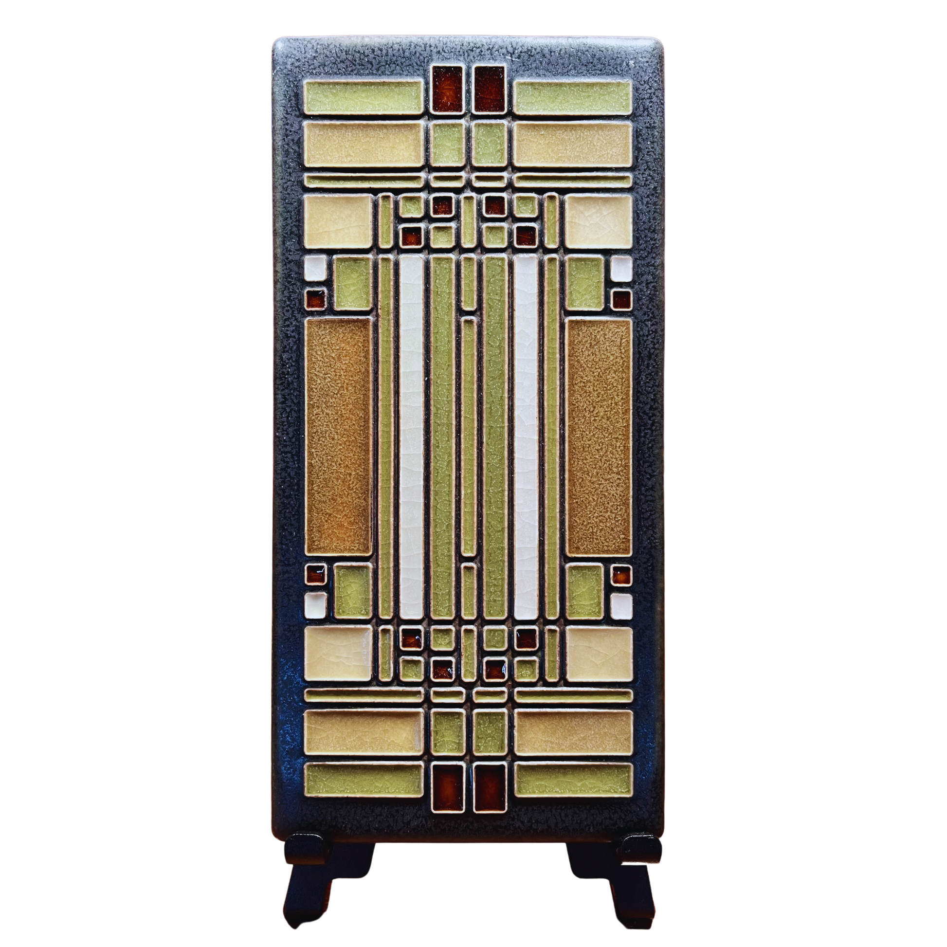 This Oak Park Skylight Art Tile is based on one of a pair of art glass skylights at the entrance to the octagonal studio in Frank Lloyd Wright's Oak Park home circa 1897. The autumnal colors transformed the interior light as the seasons changed, which made a dramatic first impression on Wright’s clients and visitors.