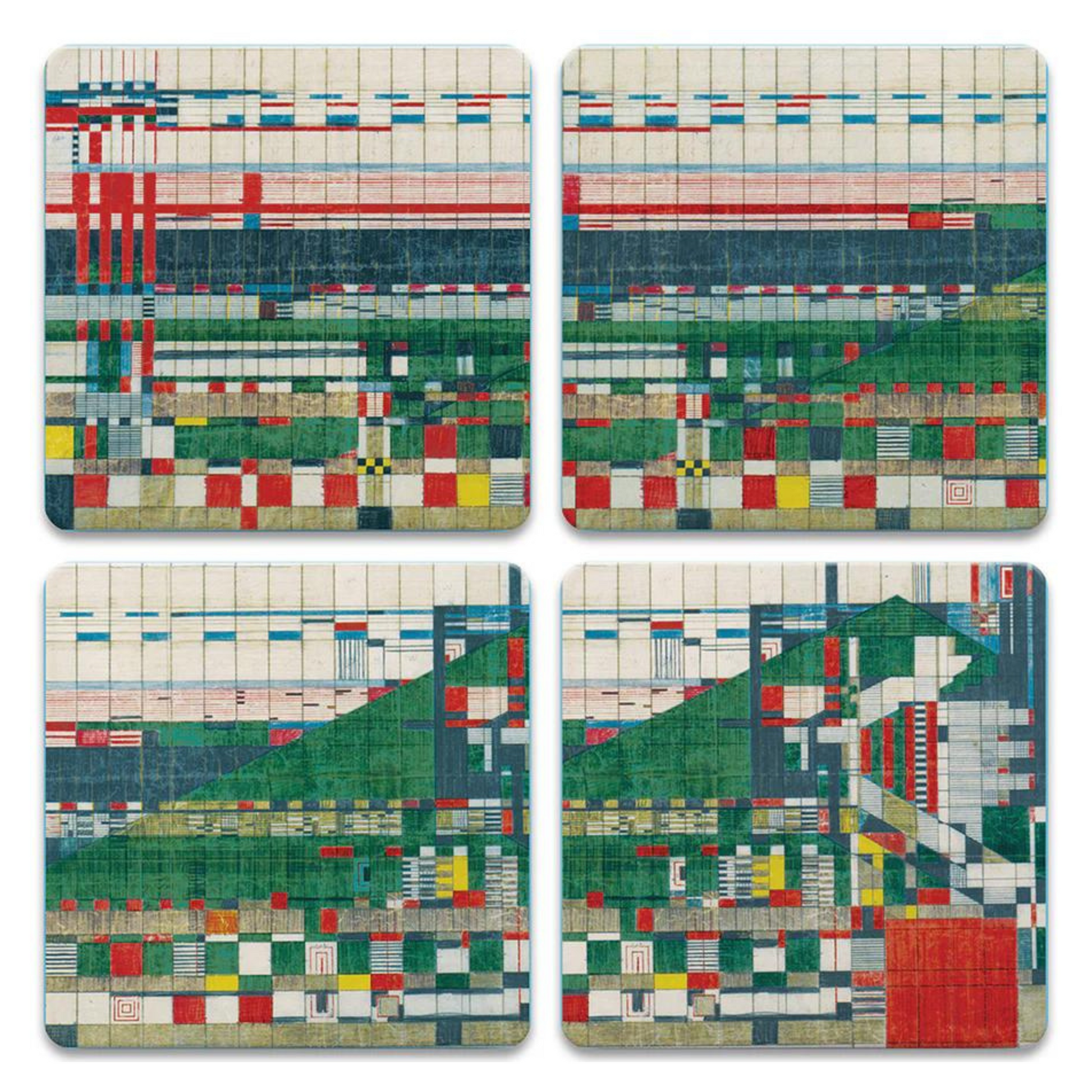 This set of four absorbent stone Coasters showcases the Taliesin landscape through an abstract design for the Hillside Theater Curtain that, when pieced together, forms the full scene as envisioned by Wright.