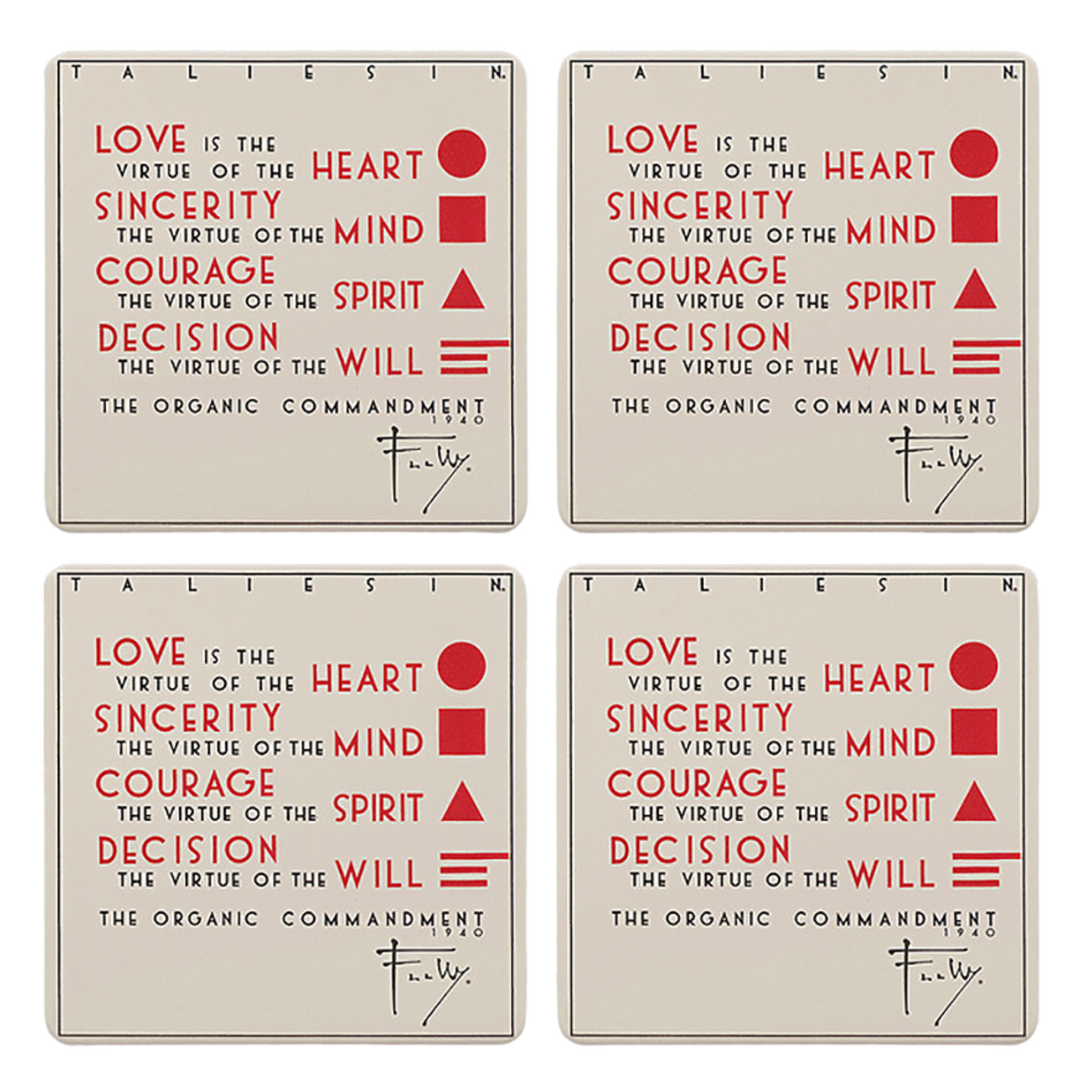 Wright's Organic Commandment expresses his ideals, but these poetic statements can offer inspiration every person. Made of absorbent sandstone with cork-backing. Set of 4, 4.25" square.