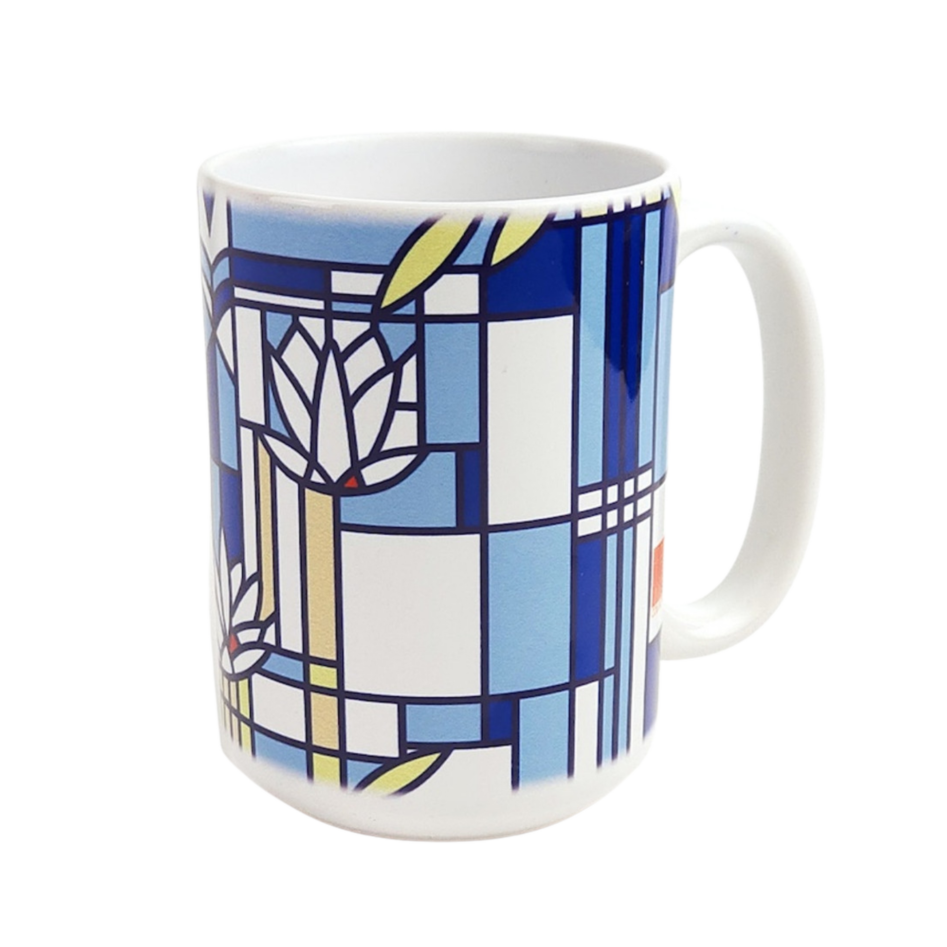 This Frank Lloyd Wright Waterlilies Ceramic Coffee Mug features a design adapted from an unrealized 1895 window design. The elegant pattern showcases flowers and lily pads floating on a serene pool of water.