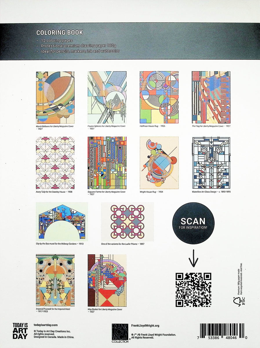 This coloring book features 12 Frank Lloyd Wright illustrations, featuring professional premium paper 180G suitable for pencil, marker, ink, watercolor and more.