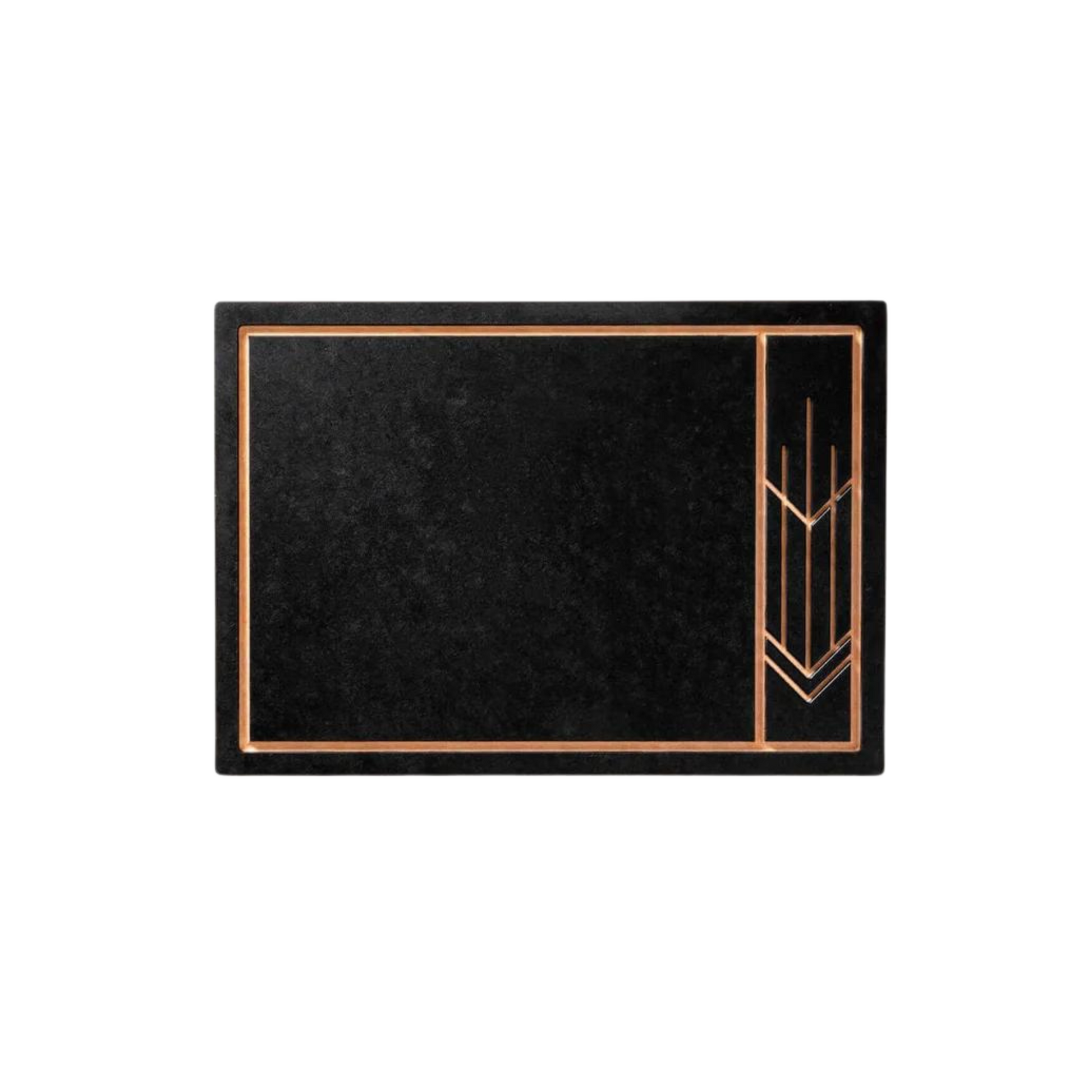 Enhance your kitchen with this elegant 13.75" x 9.75" Cut & Serve Board, produced in collaboration between Epicurean and the Frank Lloyd Wright Foundation. Featuring a minimalist black surface with a carved border and a striking geometric arrow, this piece is as stylish as it is functional. Originally crafted from waste materials generated during the construction of custom skateparks, it beautifully embodies sustainable design.