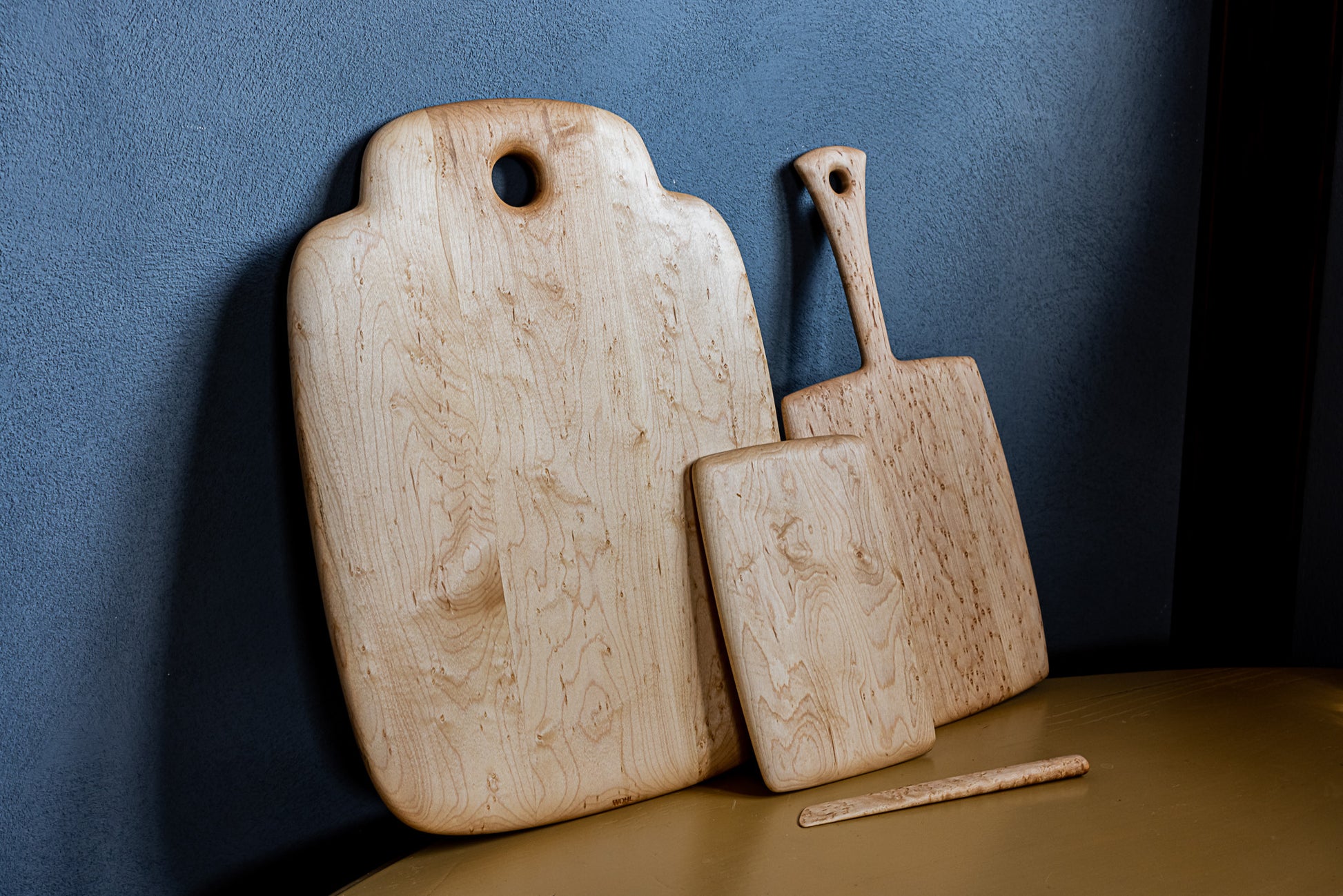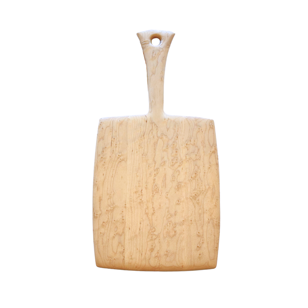 Enjoy the handcrafted 7.75" x 15.5" Birdseye Maple Cutting Board by Edward S. Wohl Woodworking and Design Featuring rounded corners and an angular, tapered handle with a hole for easy use, this board highlights the natural beauty of the wood's grain. Each piece is one-of-a-kind, adding timeless craftsmanship to any kitchen.