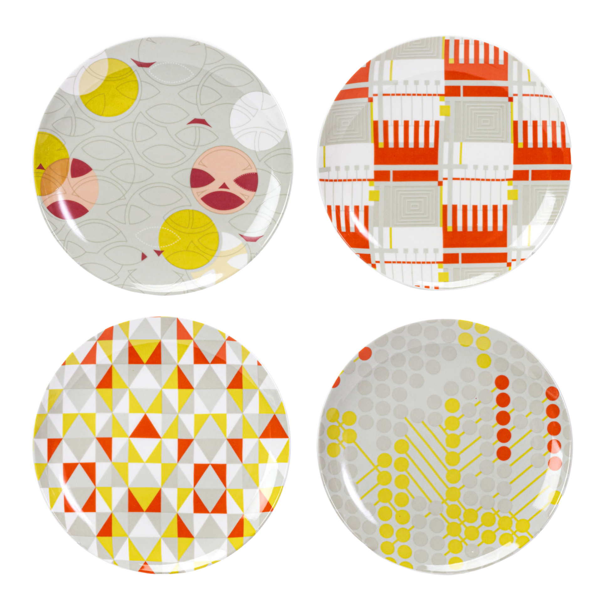 Elevate your table with a touch of mid-century modern flair using this Set of Four Dessert Plates, inspired by Frank Lloyd Wright's 1955 "Taliesin Line" textiles. Adapted from his vibrant fabric and wallpaper designs, these plates feature bold orange and chartreuse hues arranged in striking geometric patterns. While some designs echo Wright's architectural projects, many stand as unique artistic expressions, reflecting his innovative vision in decorative arts.