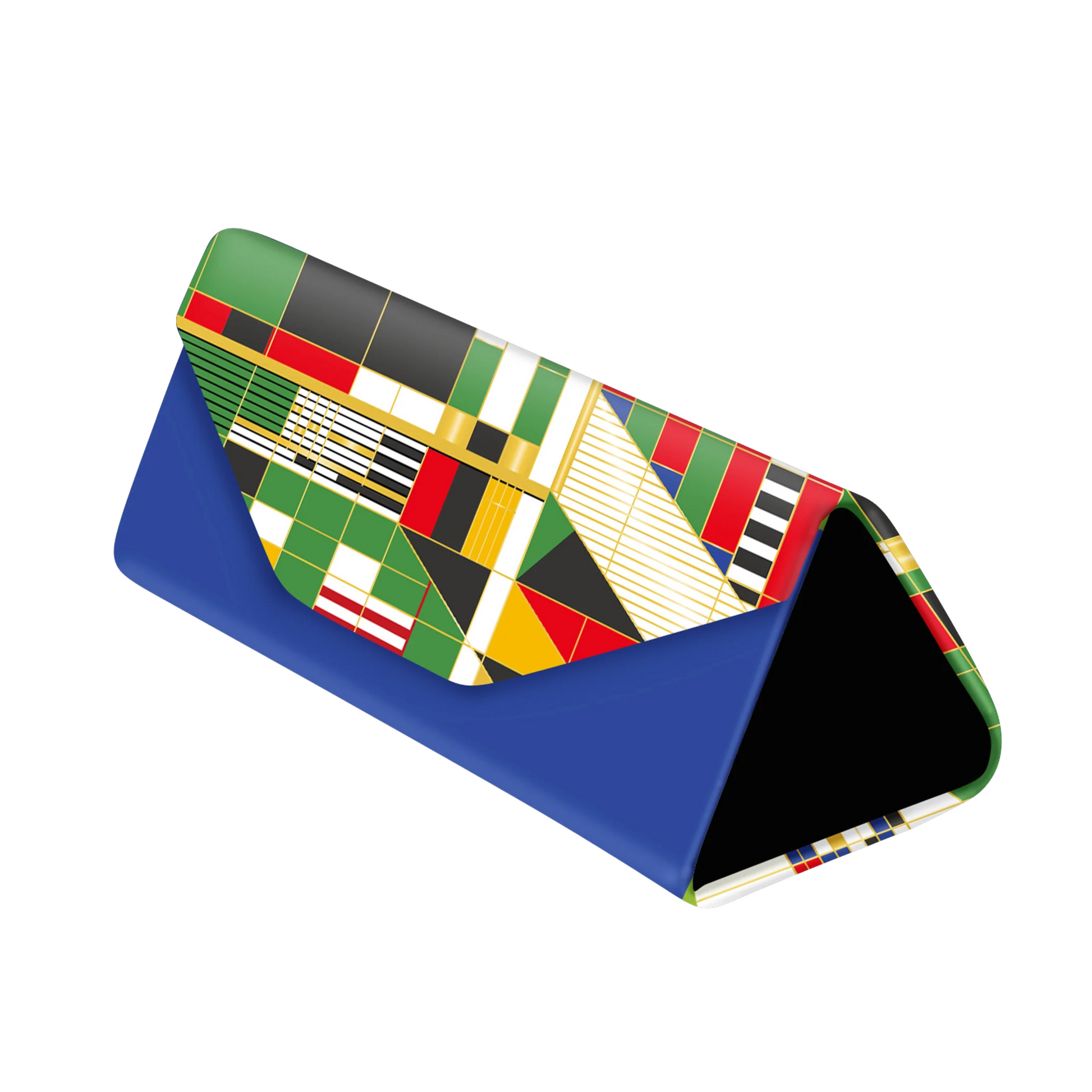 Brilliantly simple folding triangle case fits sunglasses and eyeglasses of all sizes. Matte soft touch vegan leather features a stunning overall art print. Case is sturdy, yet folds flat for compact storage. Ultra-soft lining keeps glasses from scratching.