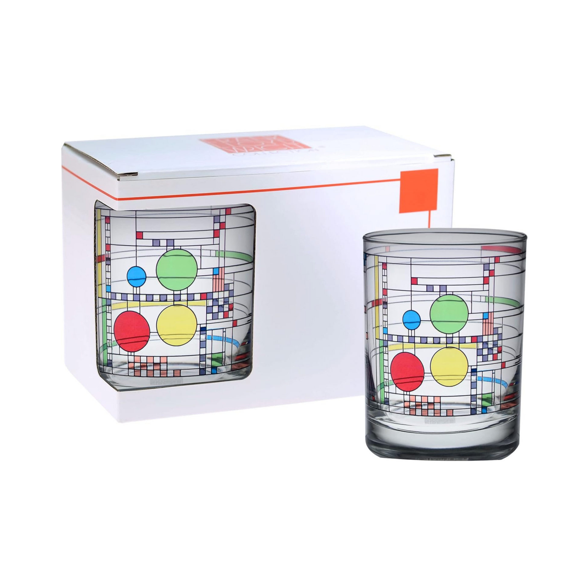 This double old fashioned glass features a playful art glass window design from Avery Coonley Playhouse created by Frank Lloyd Wright in 1912. With asymmetrical geometric designs and suggestions of flags, balloons, and confetti; the brightly colored windows bring to mind a parade