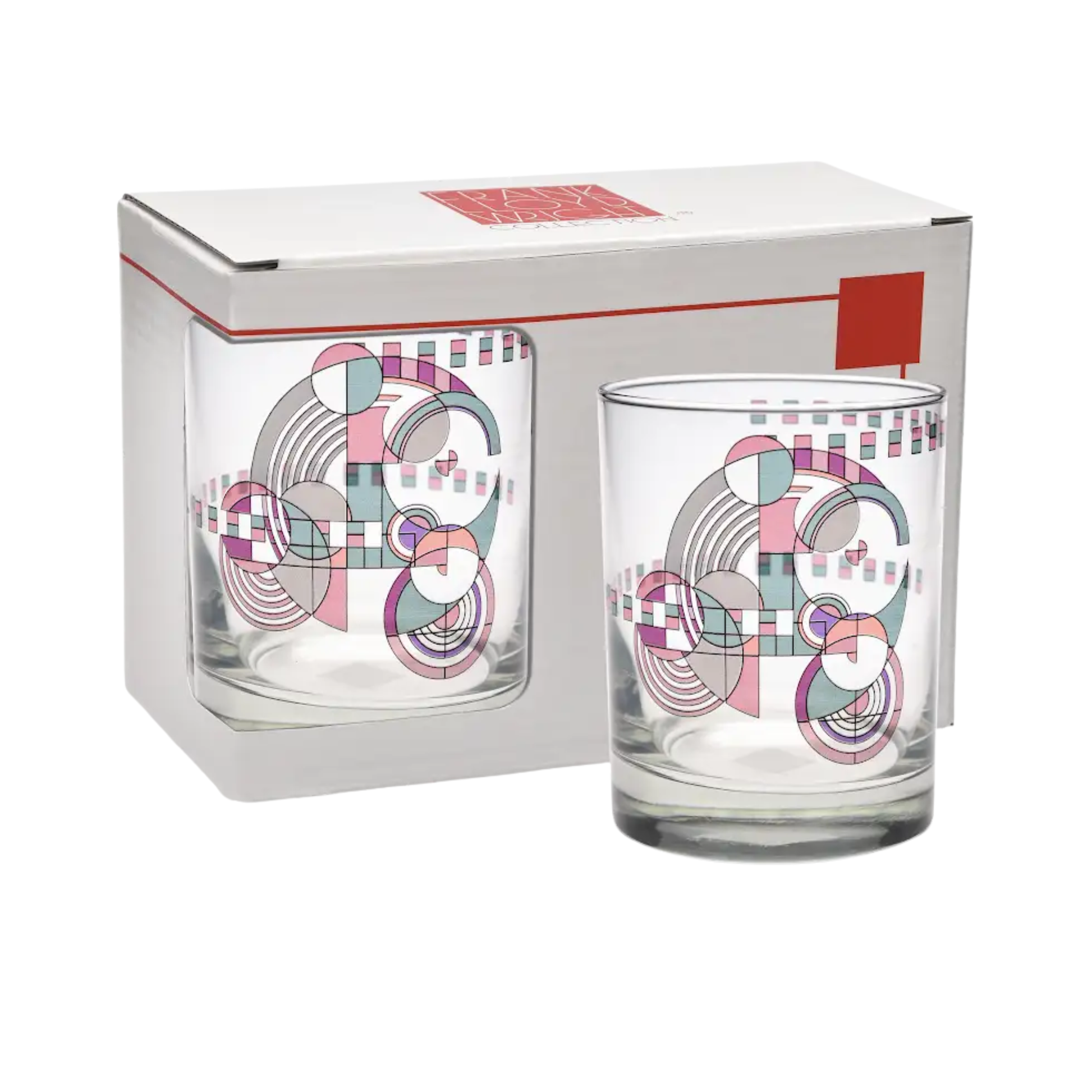 This rug was never executed for that house but, after Wright's death, Mrs. Wright had it manufactured for their home at Taliesin in Spring Green, Wisconsin. These Old Fashioned Glasses featuring the Hoffman rug design is inspired by this rug.