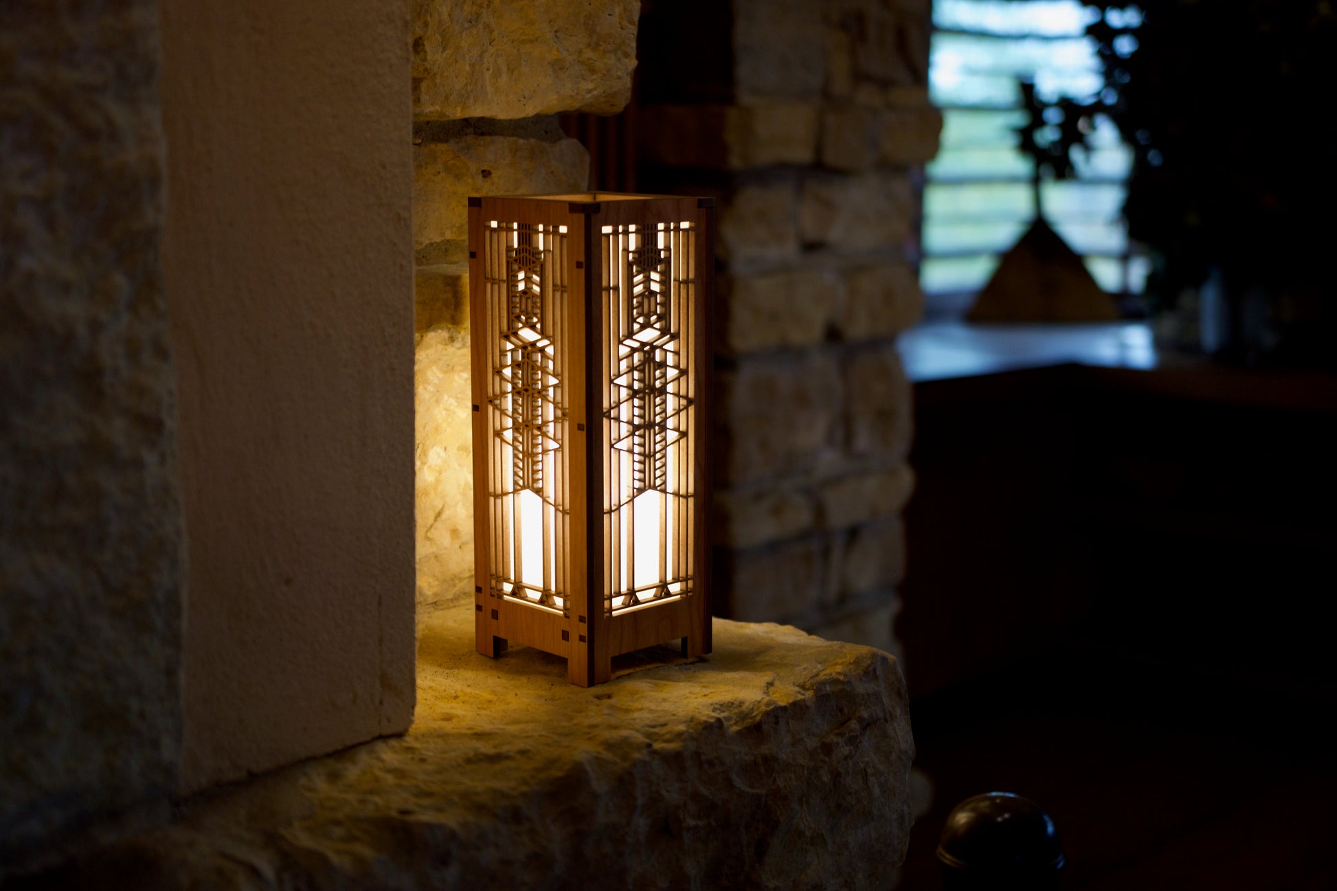 Adapted from one of the art glass windows in the Frederick C. Robie House (1908), this design by Frank Lloyd Wright, uses the color and delicate geometric diamond and chevron shapes are abstractions of the surrounding Midwest foliage and grain shafts.