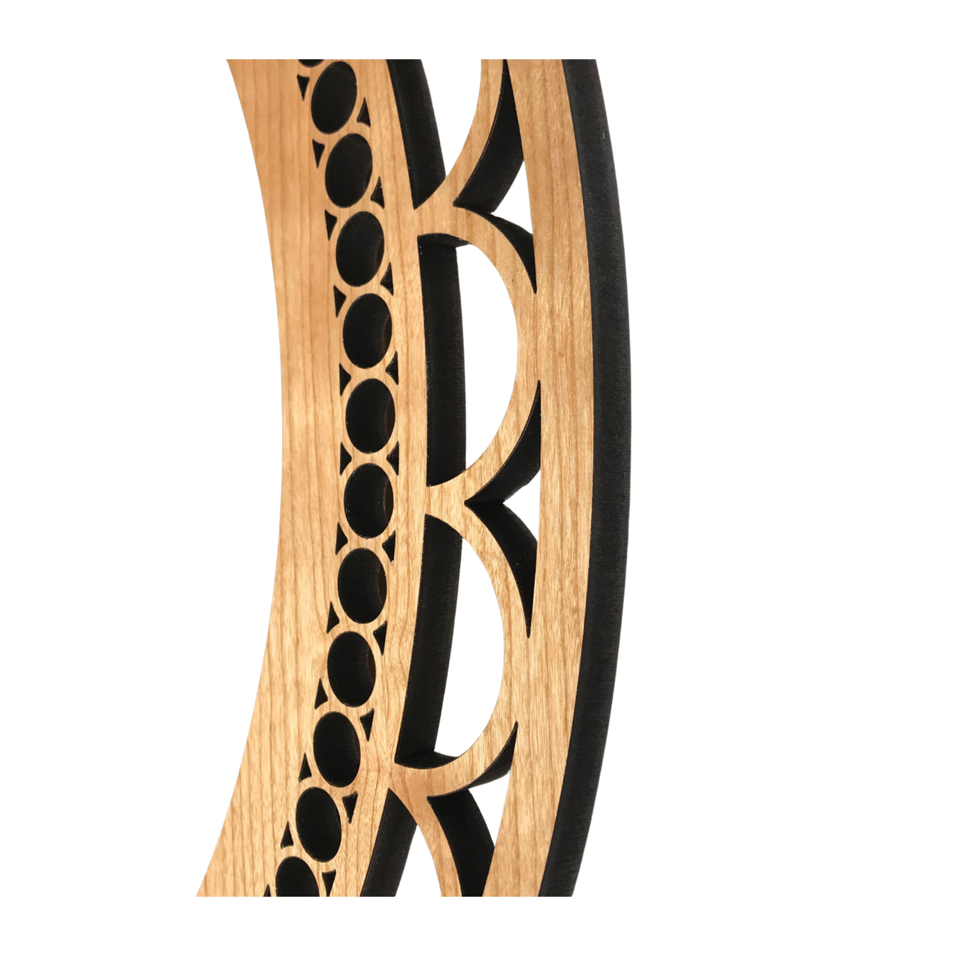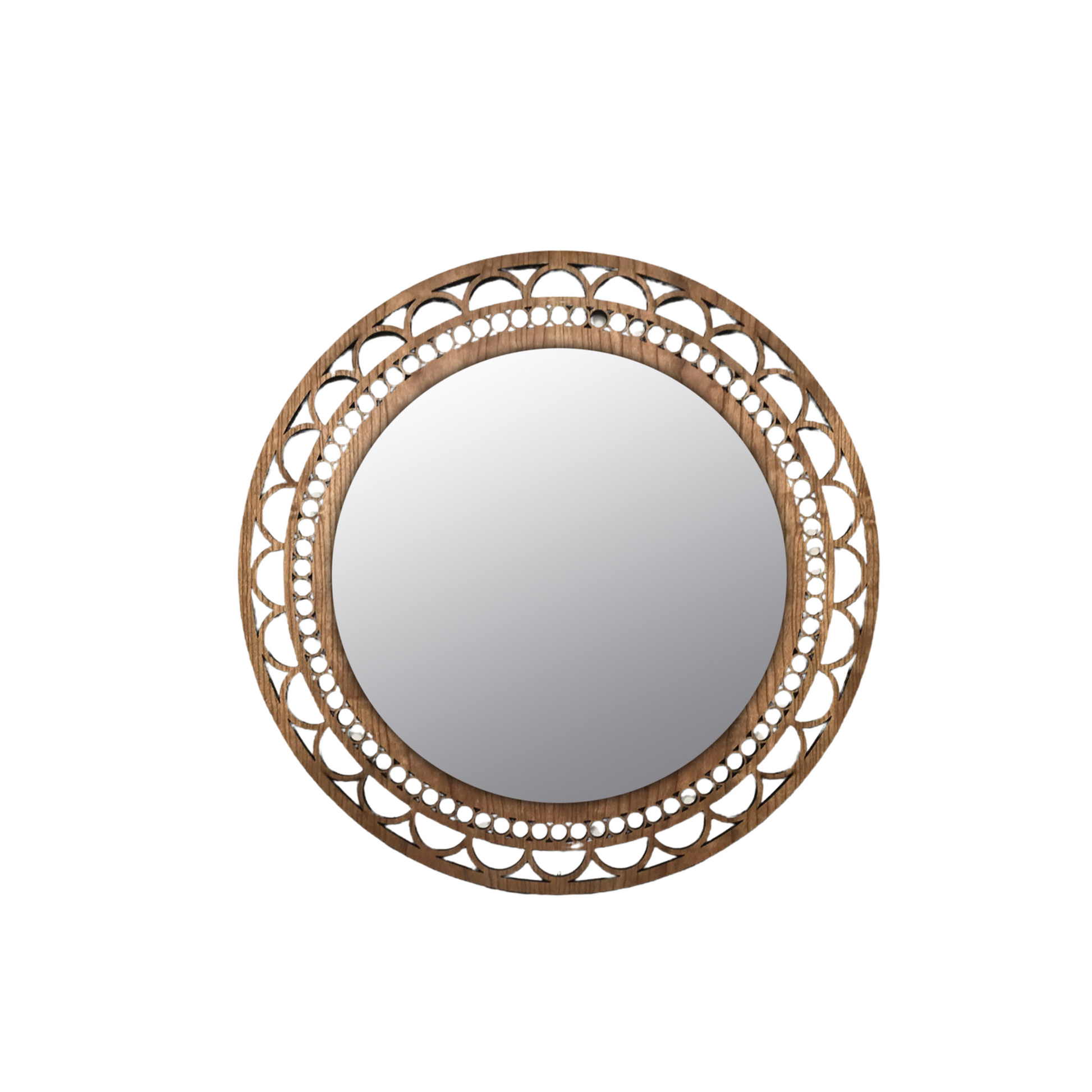 Made with 1/2" thick cherry veneered MDF with mirrored acrylic in the center. Measures 23-1/2" in diameter x 1" thick. Includes a keyhole on the back for hanging. All AlaModerna products are made in the USA.