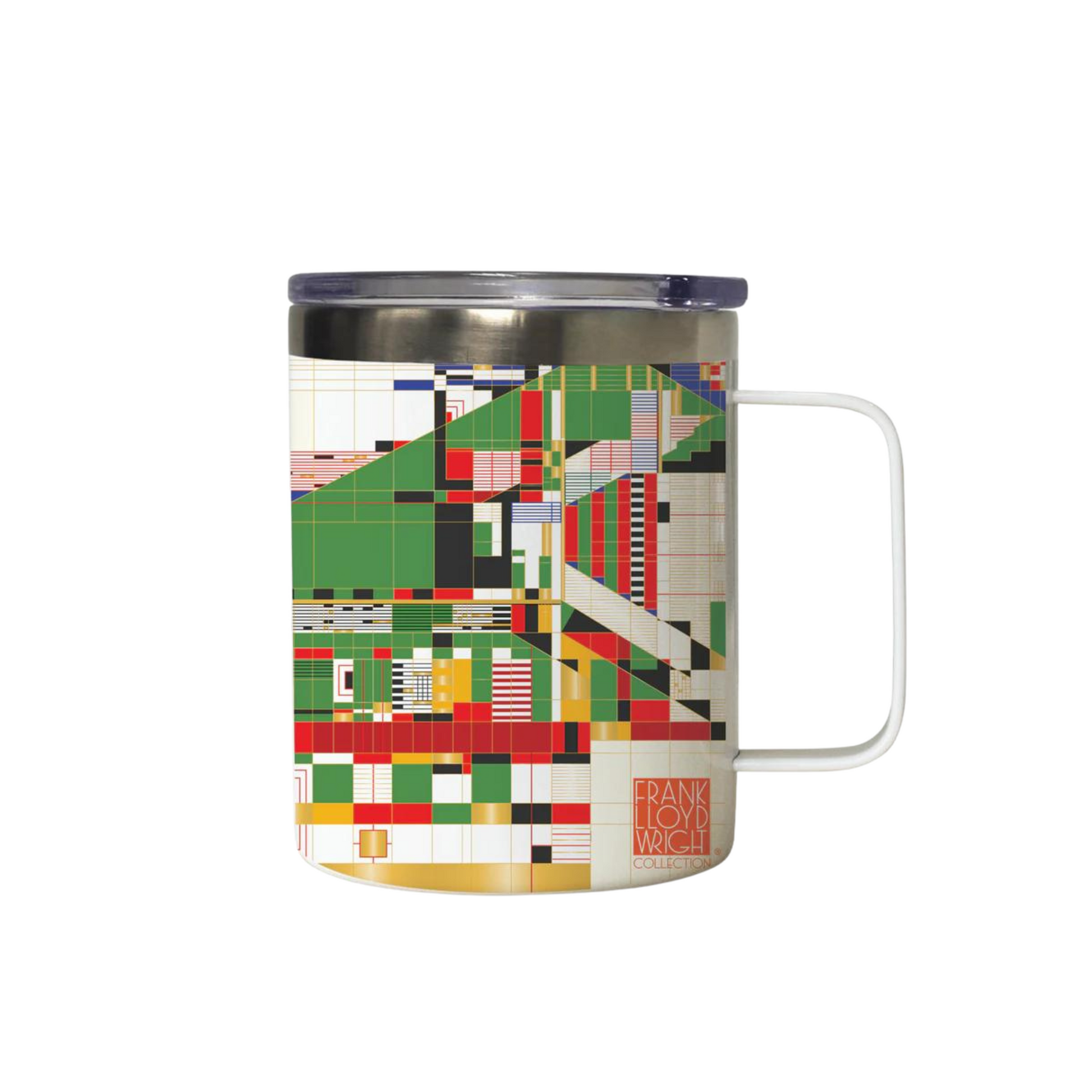 Artful 12 oz. travel mug with an adaptation of Wright's Hillside Curtain design, from the theater located on the Taliesin property in Spring Green, Wisconsin.