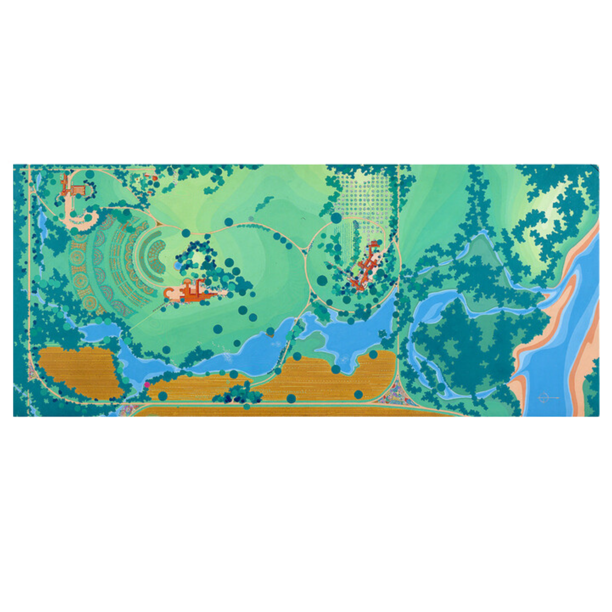This fascinating aerial drawing is of Taliesin, Frank Lloyd Wright’s summer home, school, and studio in Spring Green, Wisconsin, the site of his family’s farm.