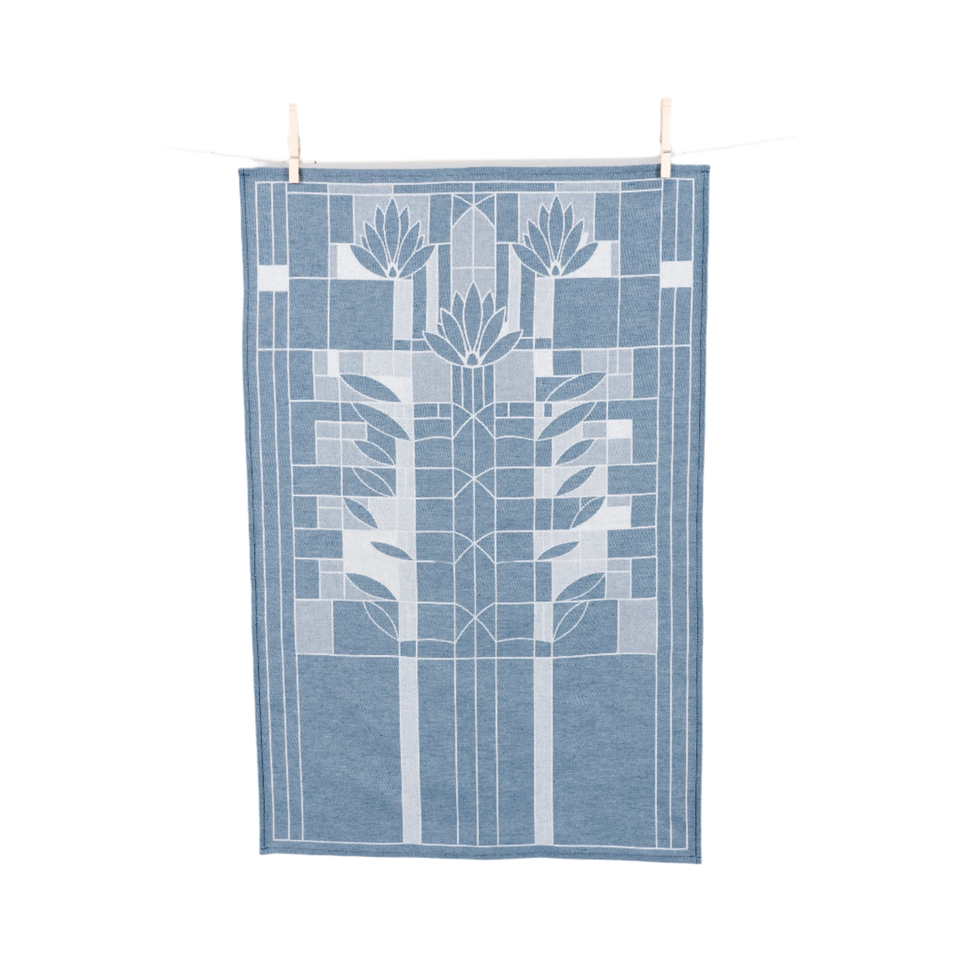 Transform your kitchen with the Waterlilies Blue Jacquard Tea Towel, an elegant interpretation of Frank Lloyd Wright's iconic design. Inspired by the serene ponds of the Midwest where Wright grew up, the Waterlilies design was created in 1895 for an art glass screen that was never produced but has since become one of Wright's most celebrated patterns.