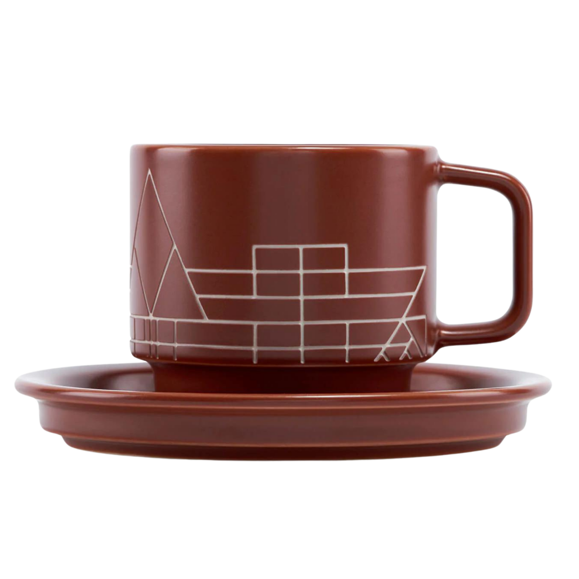 The Terra stoneware teacup and saucer showcases one of Frank Lloyd Wright’s original designs etched into the cup's surface, capturing the essence of Wright’s design principles and his relationship with nature. Each set includes an oversized stoneware saucer in matching Sienna. Pairs perfectly with the new Terra Teapot.