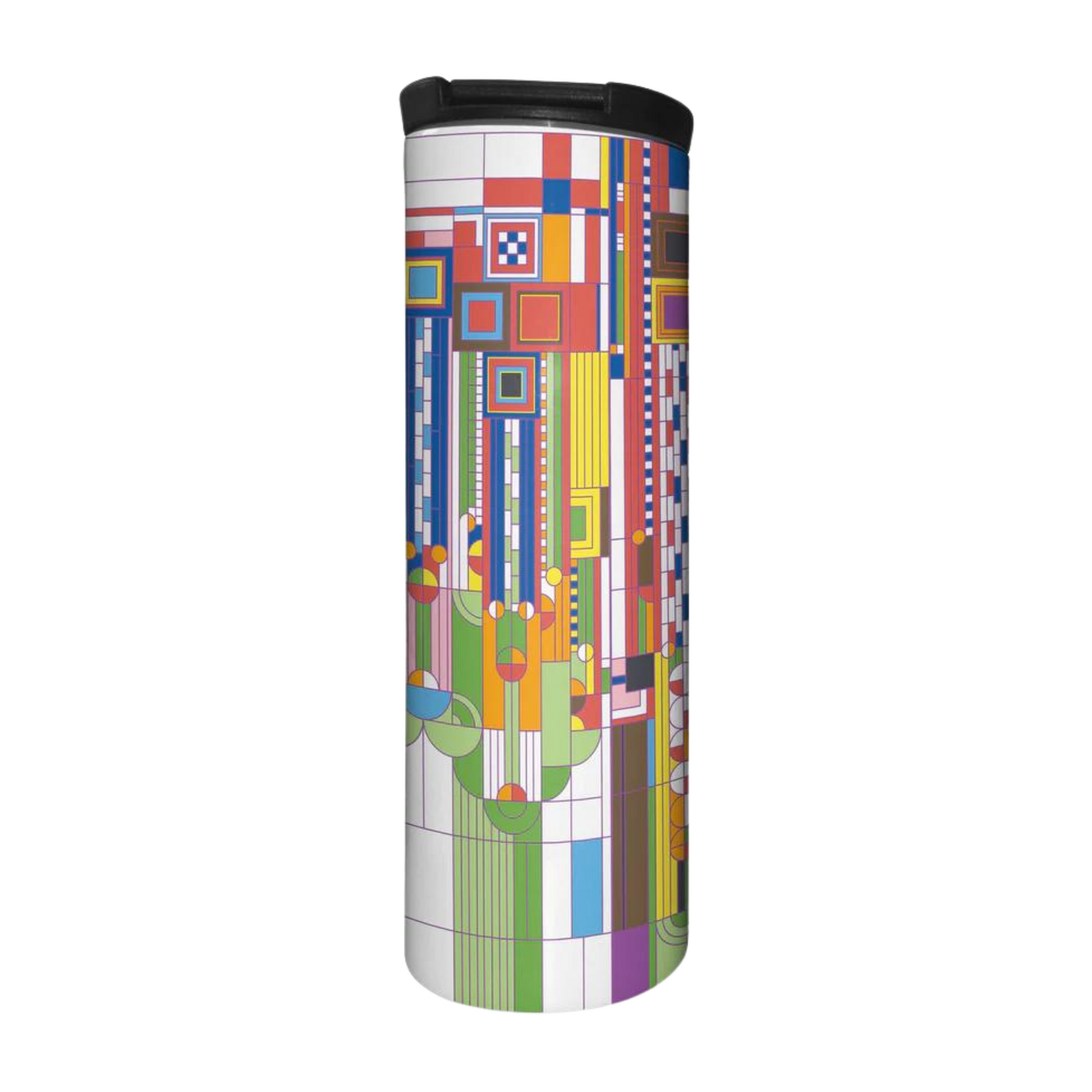 Artful travel mug with an adaptation of Wright's Saguaro Forms and Cactus Flowers design.