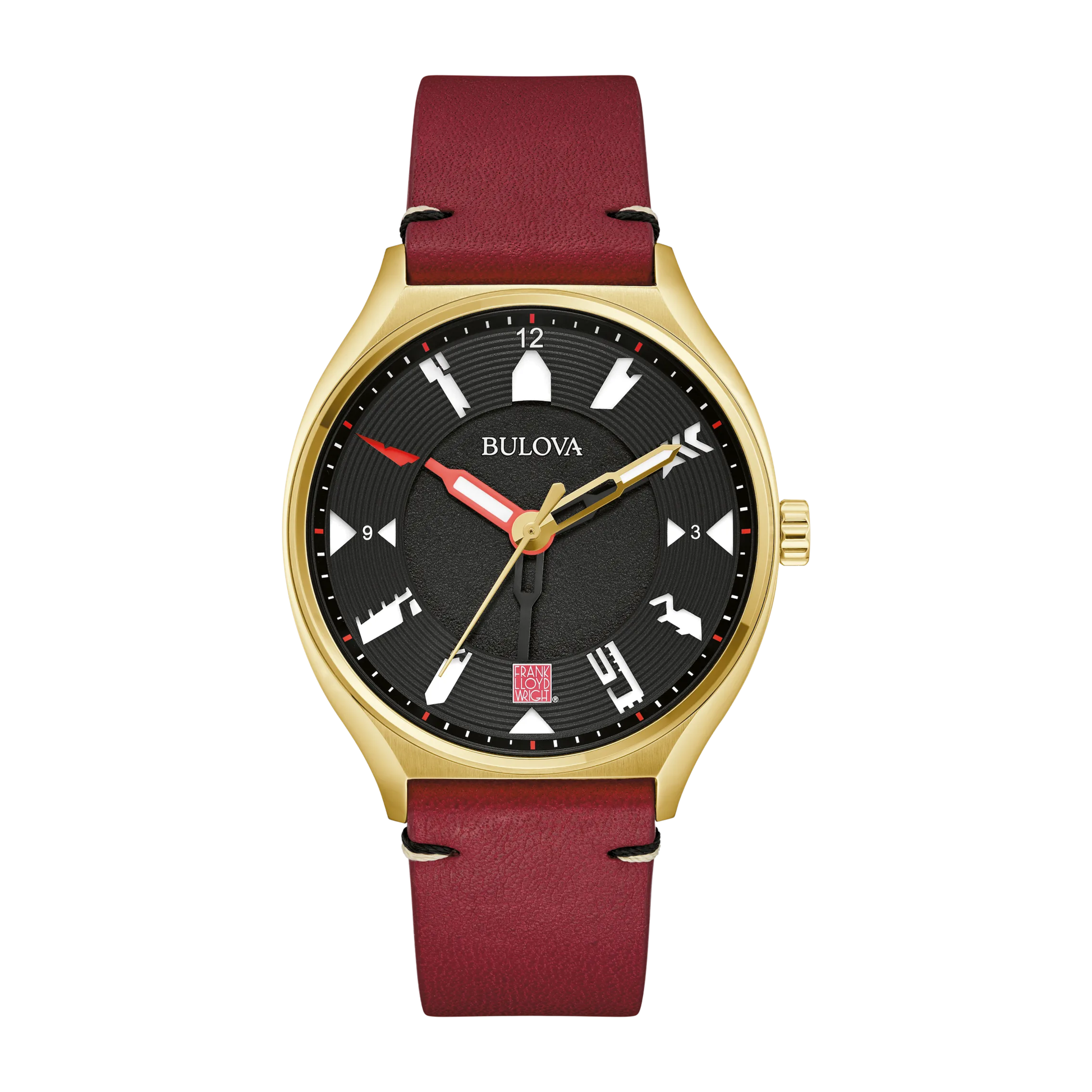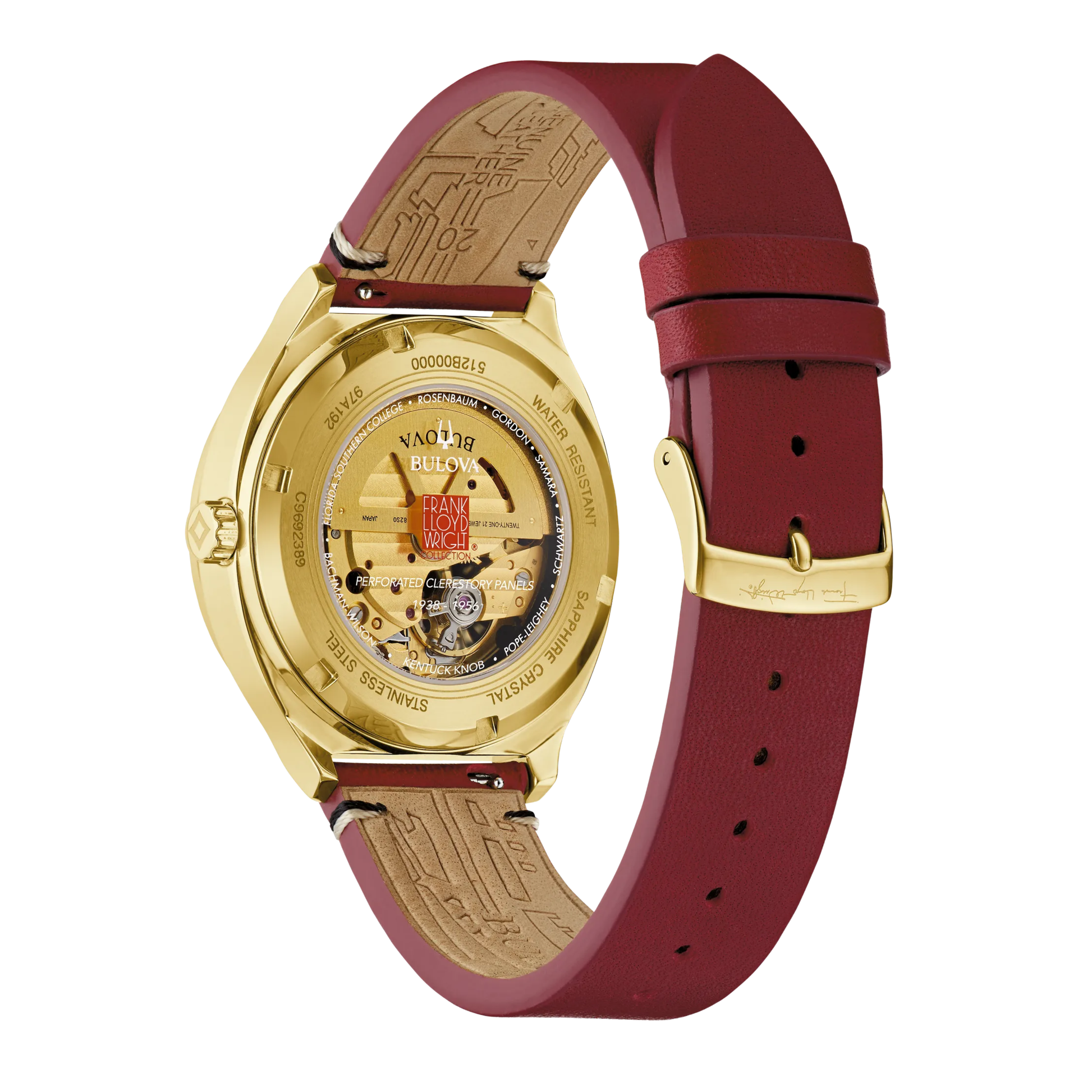This collector’s watch features a 40mm gold-tone stainless steel case with a sapphire crystal with anti-reflective coating and a rich burgundy leather strap, evoking the warmth of the Usonian aesthetics. The black dial is constructed in multiple layers with cutout markers inspired by the perforated clerestory panels in Usonian homes revealing a luminous white Super-LumiNova layer beneath, as well as red and gold hour hands and an additional hour indicator in Wright’s signature red, highlighting the current hour. The watch is powered by an automatic movement with 21 jewels and a power reserve of 42 hours. Honor the legacy of the unique works of one of America’s greatest architects with this Bulova men’s Frank Lloyd Wright watch, offered in a Bulova signature box with a special Frank Lloyd Wright storybook.